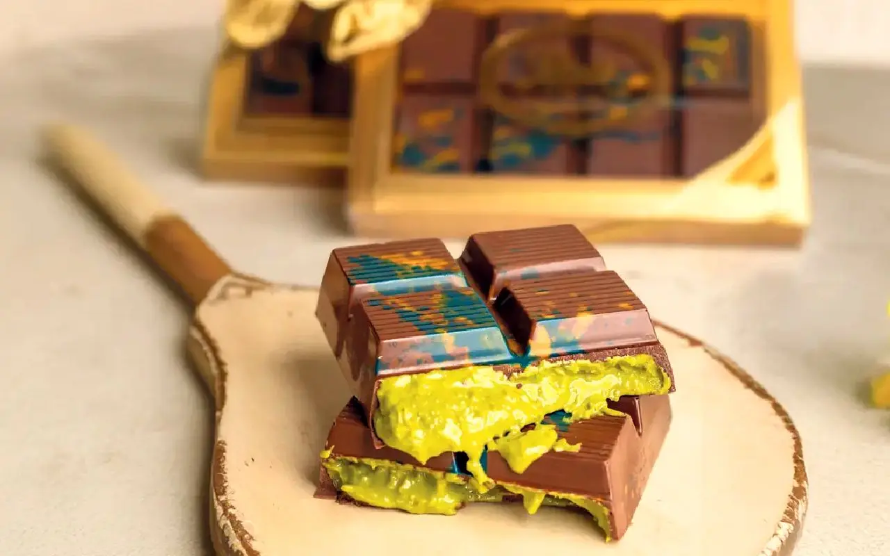 به نوشته فایننشال تایمز، این قالبهای شکلات اماراتی ترکیبی از کرِم پسته، شیرینی خردشده و شکلات شیری است که پس از آغاز تولید در سال 2021 توسط تولیدکننده اماراتی شکلات به نام FIX، موفقیت چندانی نداشت. این روند ادامه داشت تا زمانی که یک ویدئوی تیکتاک این شکلات پستهای را به شهرت جهانی رساند.
