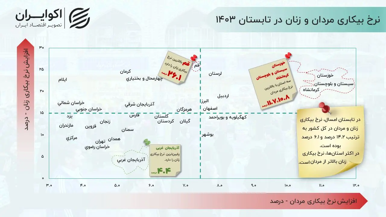 استانهایی مثال اصفهان، البرز، گیلان و کهگیلویه و بویراحمد نیز در مراکز میانی قرار گرفتهاند و در آنها نرخ بیکاری زنان و مردان به طور نسبی بالا است.