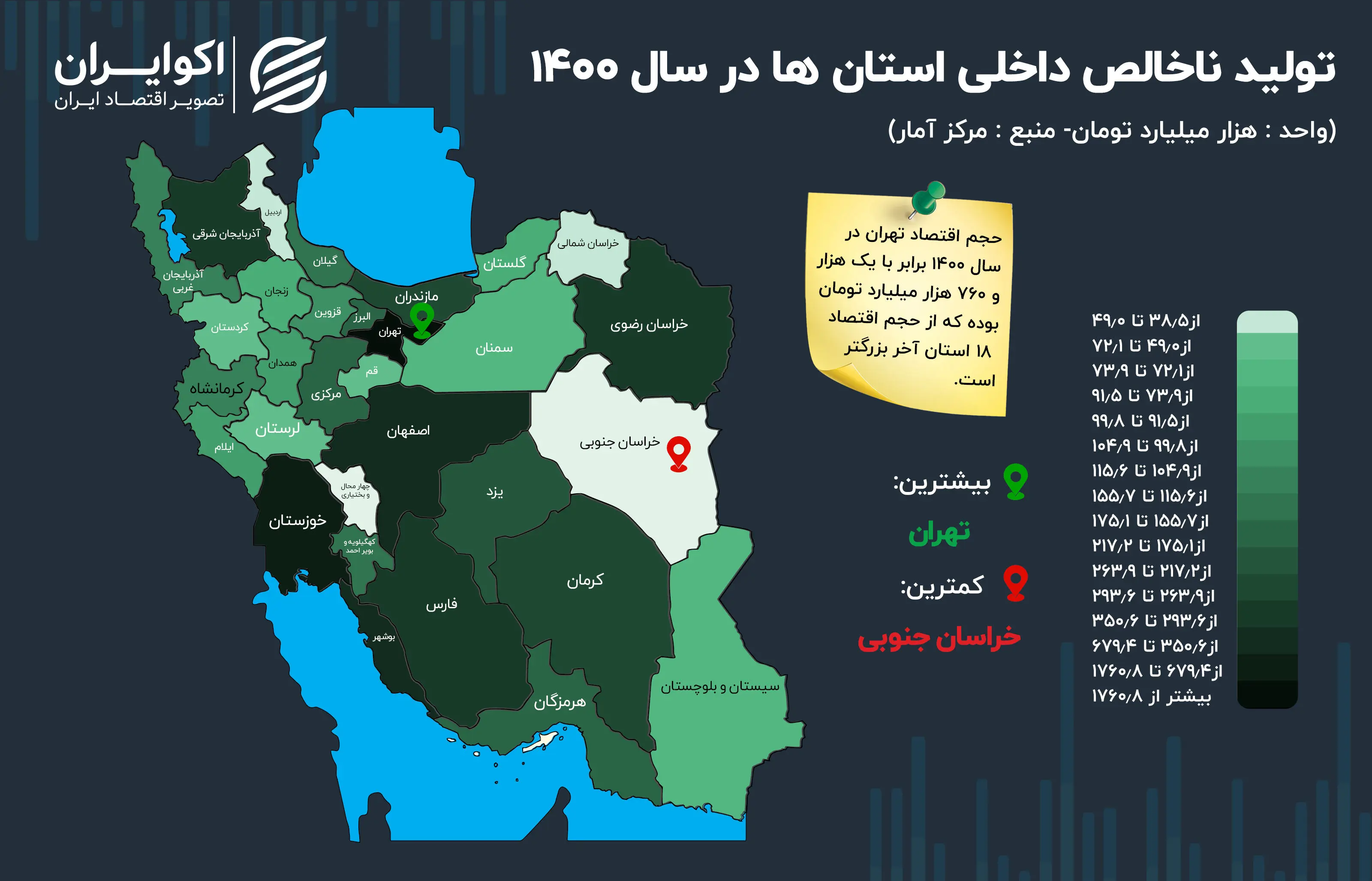 جدیدترین گزارش مرکز آمار از ارزش افزوده تولید شده در استانهای کشور حاکی از آن است که تولید ناخالص داخلی کشور به سال پایه 1400 در سال 1400 معادل 8533 هزار میلیارد تومان بوده است. بالاترین سهم از این مقدار به استان تهران اختصاص یافته که در سال 1400 حجم اقتصاد این استان معادل 1760 هزار میلیارد تومان بوده است. علت این امر به موقعیت خاص این استان ارتباط دارد. تهران پایتخت کشور است و عمده سرمایهگذاری و فرصتهای اقتصادی در این استان یافت میشود و از همینرو جای تعجب ندارد که این استان بالاترین ارزش افزوده تولید شده در میان استانهای کشور را به خود اختصاص دهد.