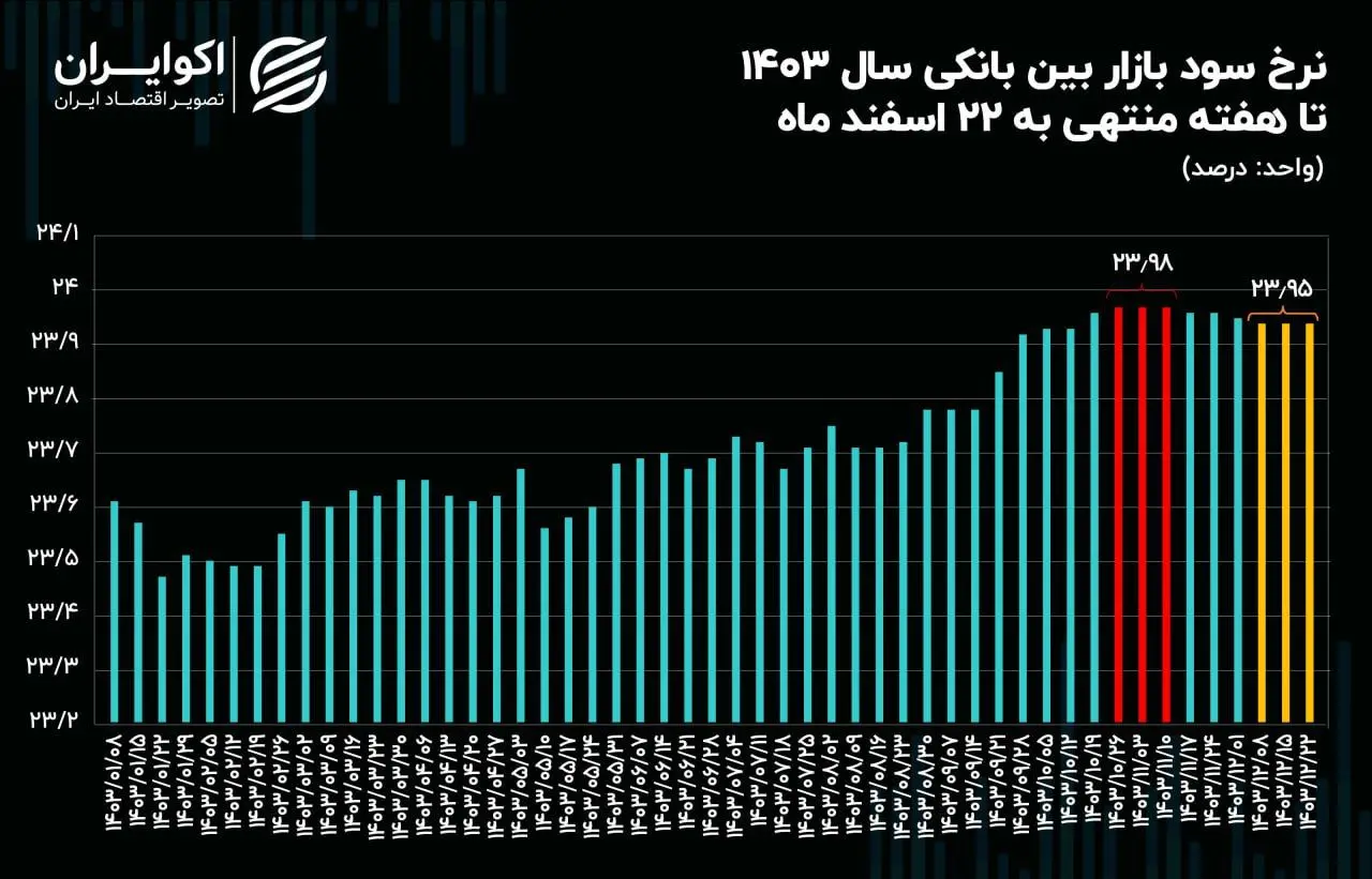 روند نرخ بهره بین بانکی در طول یک سال گذشته نشان میدهد که فشار نقدینگی بانکها تا نیمه اول سال شدید نبوده اما از نیمه دوم سال با سرعت بالایی تشدید شده تا حدی که در میانه زمستان به سقف تاریخی خود (23.98 درصد) رسیده است. از ۱۷ بهمن ماه به مرور نرخ بهره بین بانکی کاهش یافته اما سرعت این کاهش به دلیل نیاز شدید بانکها به نقدینگی،چشمگیر نبوده است. به طوریکه پس از گذشت چند هفته از شروع روند کاهشی خود همچنان در سطوح بالای دلان نرخ سود گیر افتاده است.