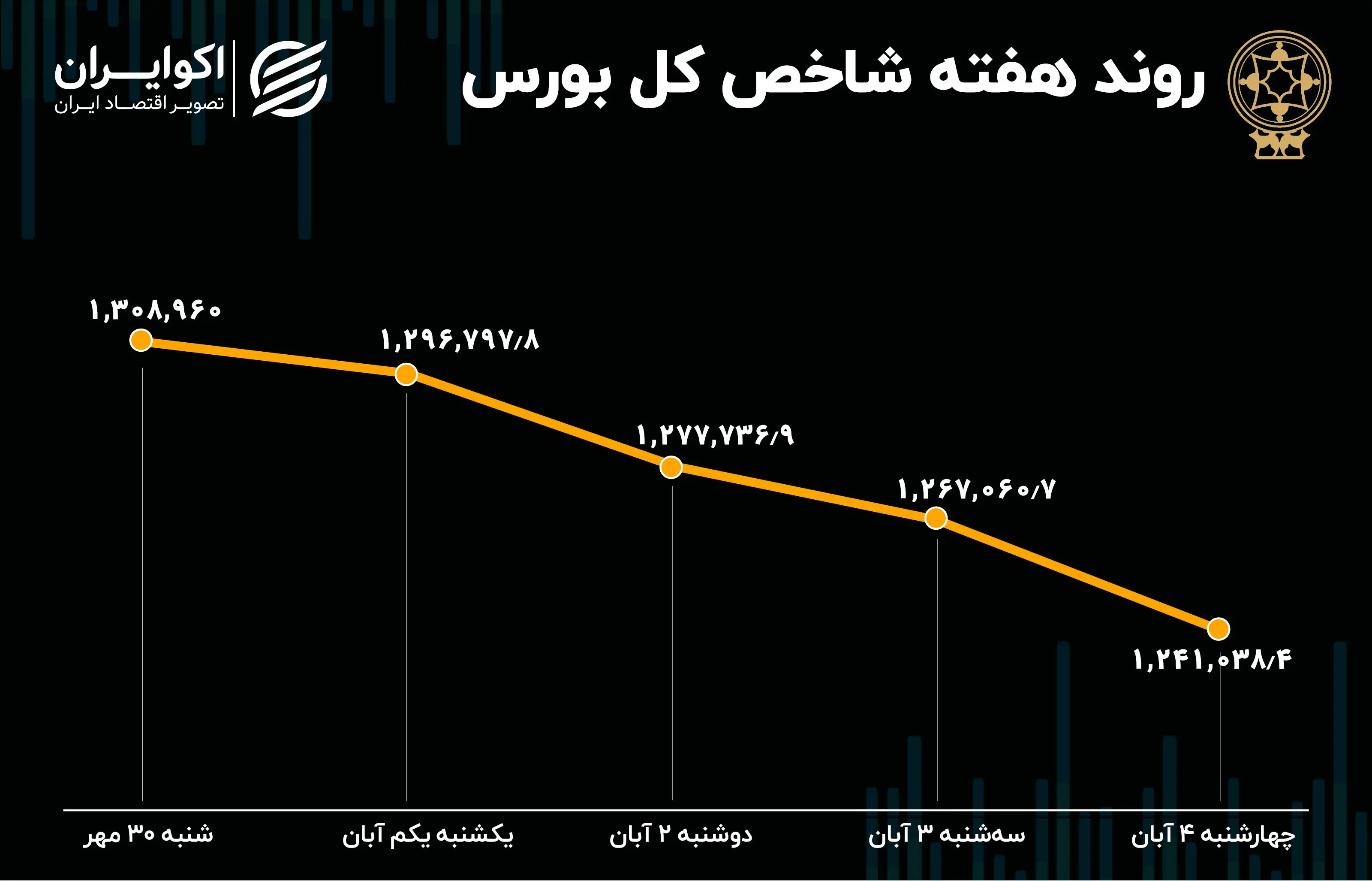 به گزارش اکوایران، روند شاخص کل بورس در تمامی روزهای هفته اخیر نزولی بود. در اولین روز کاری هفته شاخص افت هزار و 219 واحدی را پشت سر گذاشت و روز یکشنبه 9 هزار و 280 واحد پائین آمد و وارد کانال 1.2 میلیونی شد. روز دو‌شنبه نیز شاخص 19 هزار واحد سقوط کرد و روز سه‌شنبه شاخص به نزول ادامه داد و 10 هزار و 678 واحد کاهش یافت. در روز چهارشنبه نیز نرخ نزول شاخص بیشتر شد و 26 هزار و 22 واحد سقوط کرد.