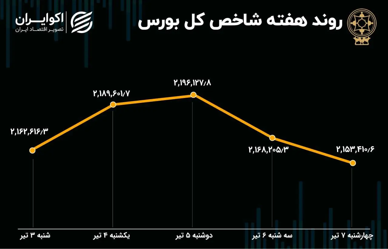 شاخص کل در آخرین روز کاری هفته به رقم 2 میلیون و 153 هزار و 410 واحد رسید و نسبت به آخرین روز معاملاتی هفته قبل 20 هزار و 483 واحد پایینتر ایستاد و بازدهی هفته شاخص بورس منفی 0.94 درصد شد.