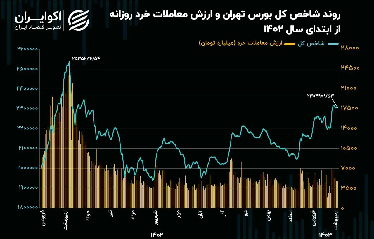 با این وجود سطح تراز دو میلیون و 300 هزار واحدی شاخص کل که آخرین بار در ششم خرداد ماه سال 1402 تجربه شده بود؛ پس از 220 روز معاملاتی در هفته قبل بار دیگر فتح شد. افزایش تراز ناگهانی و قابل توجه شاخص کل بورس تهران در هفته قبل چنان شدید بوده است که پس از فتح این تراز، نوسانات شاخص کل به شدت کاهش یافته و بیشترین تغییر با 57 صدم درصد افت تراز در سه‌شنبه هفته قبل به ثبت رسیده است.