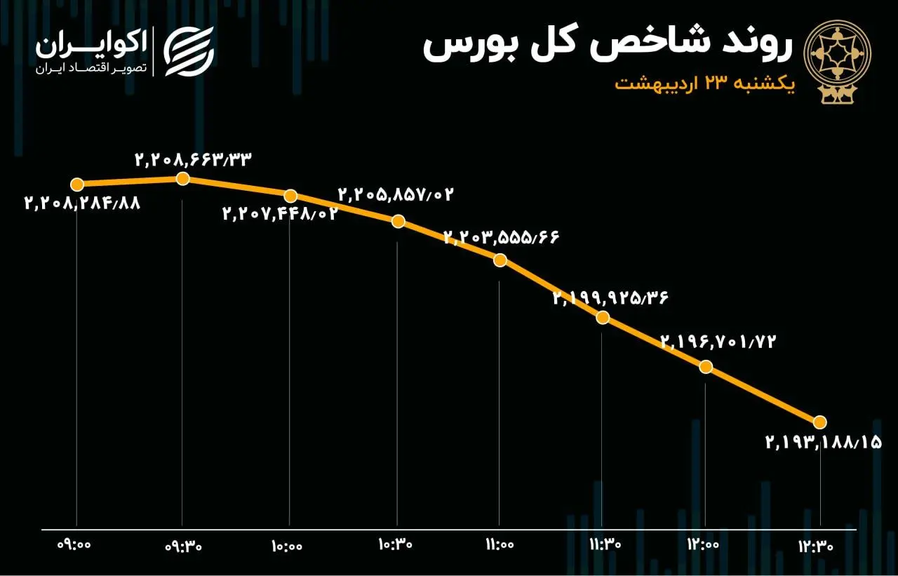 به گزارش اکوایران، در معاملات روز یکشنبه بیست و سوم اردیبهشت ماه 1403، شاخص کل بورس تهران برای دهمین روز ریزش کرد. شاخص 15 هزار و 95 واحد نسبت به روز کاری گذشته پایین‌تر ایستاد و به سطح 2 میلیون و 193 هزار و 188 واحد رسید.