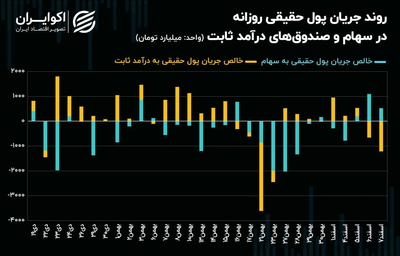 به گزارش اکوایران، بازار سهام روز سهشنبه را با روند ورودی 520 میلیارد تومانی جریان پول حقیقی پشت سر گذاشت. ارزش معاملات خرد سهام با 59 درصد افزایش به سطح 11 همتی صعود کرد و شاهد افزایش تراز بیشتر نمادهای شاخصساز بورس تهران به نسبت سهمهای سبک بودیم. دیروز خالص جریان پول حقیقی در صندوقهای درآمد ثابت منفی بود و هزار و 219 میلیارد تومان پول حقیقی از موقعیتهای درآمد ثابت کاسته شد. دیروز 682 میلیارد تومان پول حقیقی نیز به صندوقهای با پشتوانه طلا وارد شد و با ورود پول به صندوقهای سهامی مواجه شدیم.