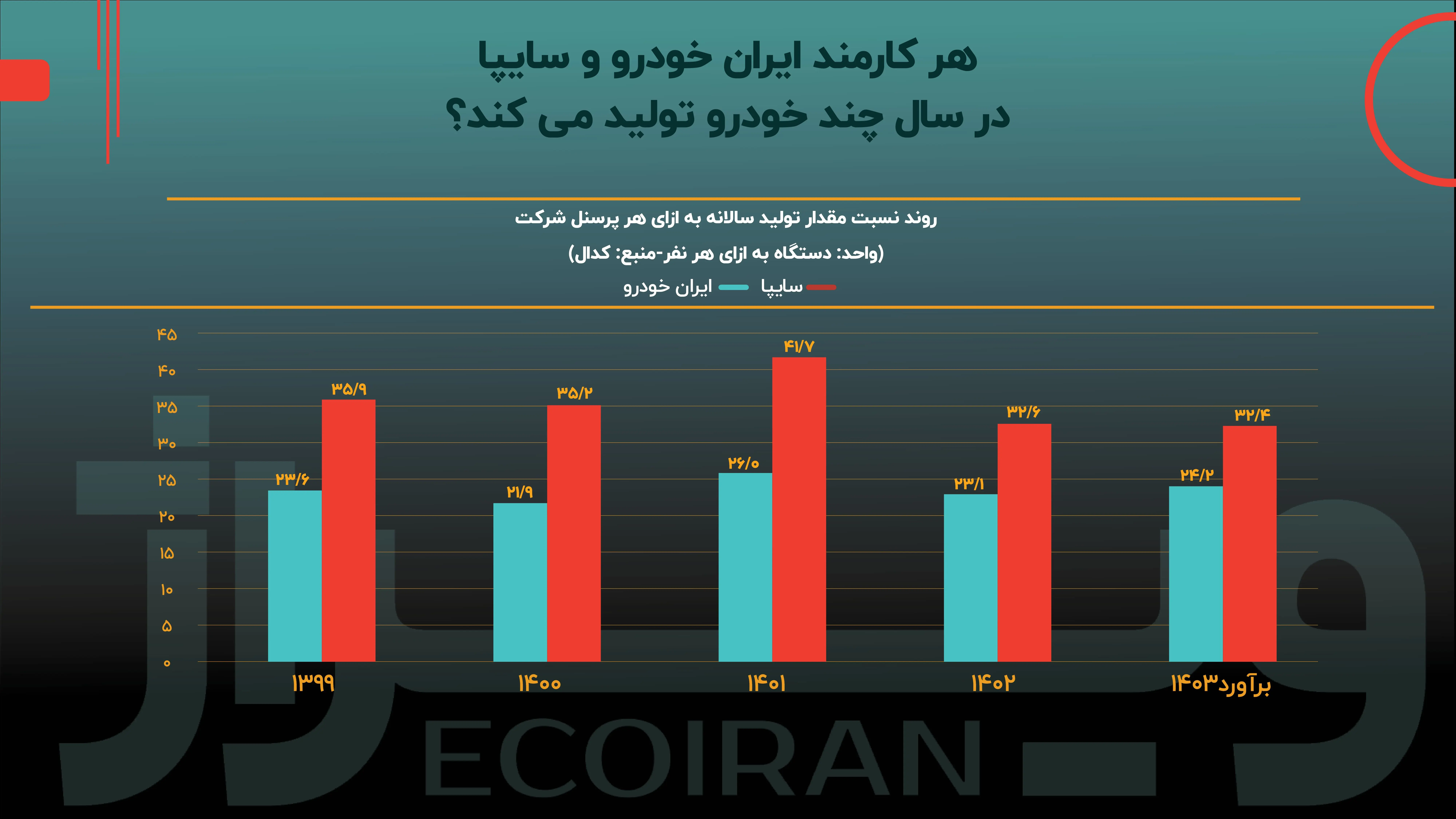 در کشورهای شرق آسیا، به ازای هر نفر نیروی انسانی سالانه حدود ۶۶ خودرو تولید می‌شود. در ایران، این نسبت بسیار پایین‌تر است. در ایران‌خودرو، هر کارمند امسال به‌طور متوسط حدود 24 خودرو تولید کرده است. در مقایسه، هر کارمند سایپا امسال 32 دستگاه خودرو تولید کرده است که نشان‌دهنده عملکرد بهتری از لحاظ بهره‌وری نسبت به ایران‌خودرو است.