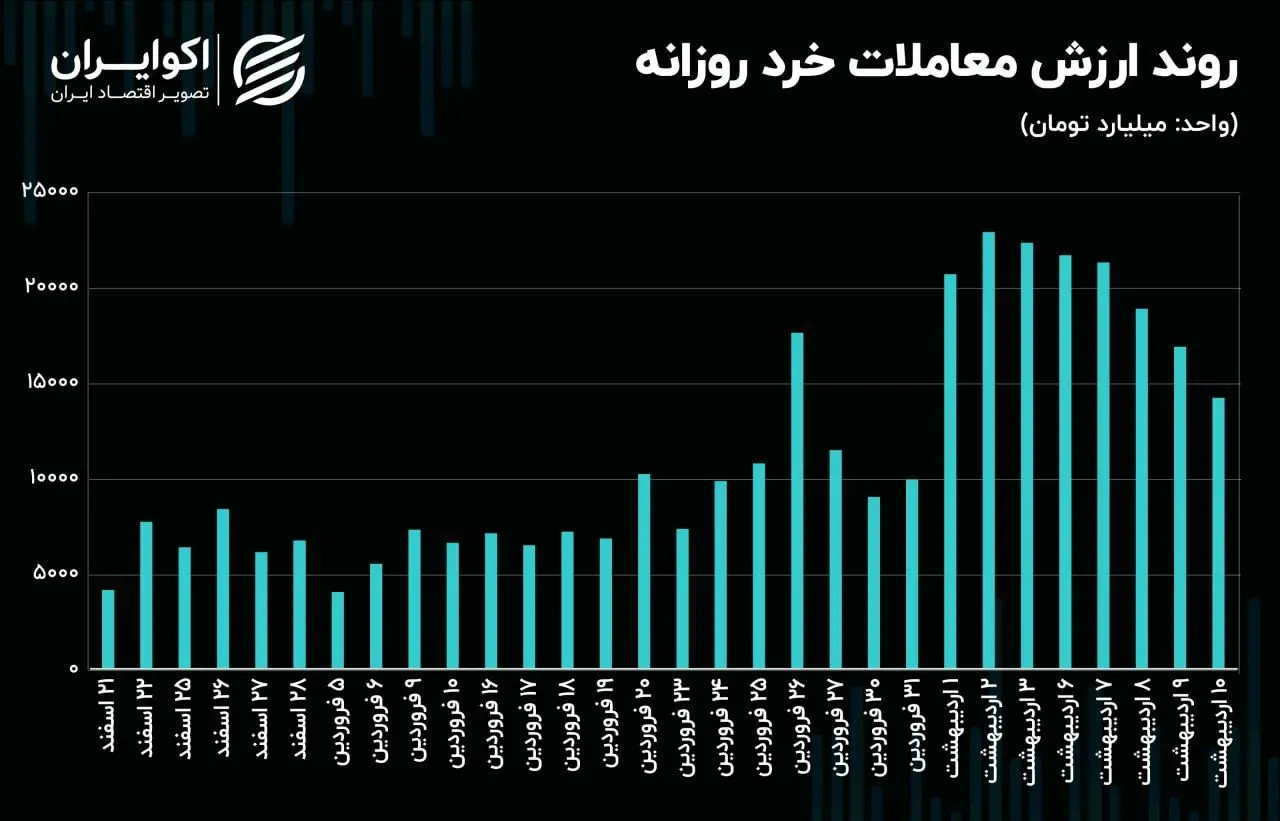به گزارش اکوایران، بازار سهام روز چهارشنبه شاهد کاهش 16 درصدی ارزش معاملات خرد بود و این معیار به سطح 14 هزار و 222 میلیارد تومانی نزول کرد. ارزش معاملات خرد در هفته گذشته 4 سطح متفاوت را تجربه کرد و به سمت رکودی شدن حرکت کرده است. با این حال متوسط ارزش معاملات خرد هفتگی در دومین هفته اردیبهشت در یکی از بالاترین سطح دوساله اخیر قرار گرفت.