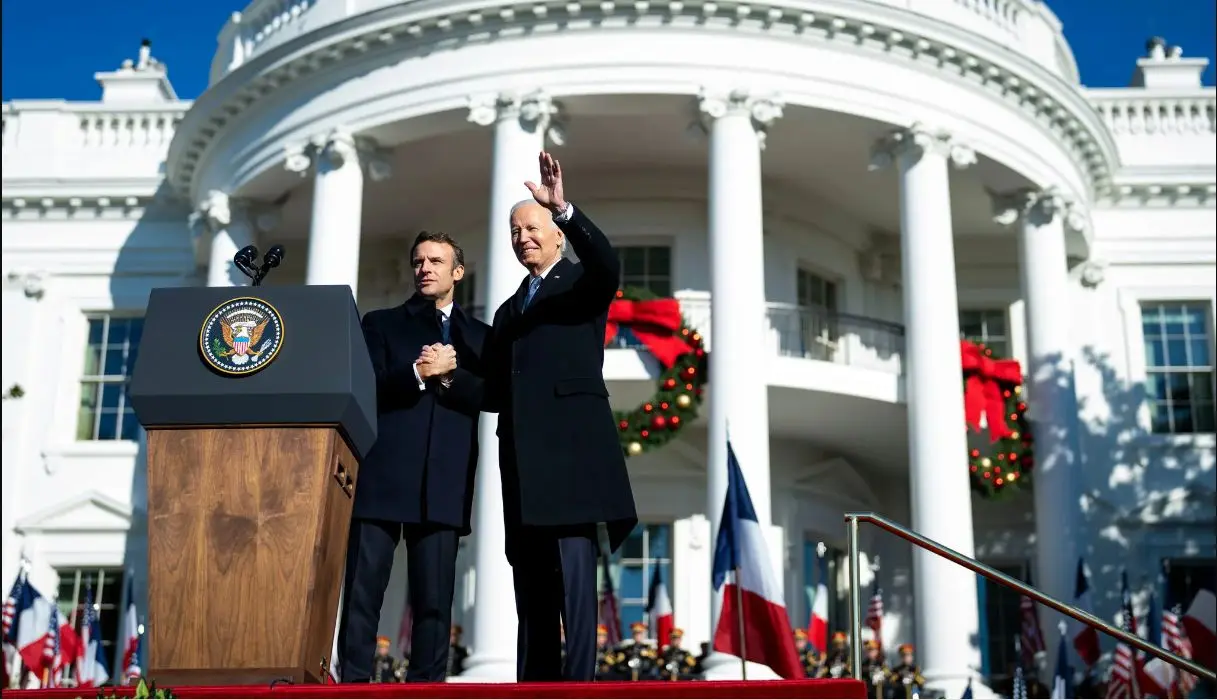 این بار در ضیافت دولتی کاخ سفید، مکرون و بایدن با کراوات هایی سیاه زیر چادری که در چمن های واقع در بخش جنوبی کاخ سفید برافراشته شده بود پشت میزی با سینی های از خرچنگ، خاویار و پنیر آمریکایی؛ غذایی ها به سبک فرانسوی ها مزین به سلایق آمریکایی به اختلاف نظرهای های جزئی میان خود اشاره کردند اما خرسندی از اتحاد حداقل در میان مدت در ظاهرشان هویدا بود.