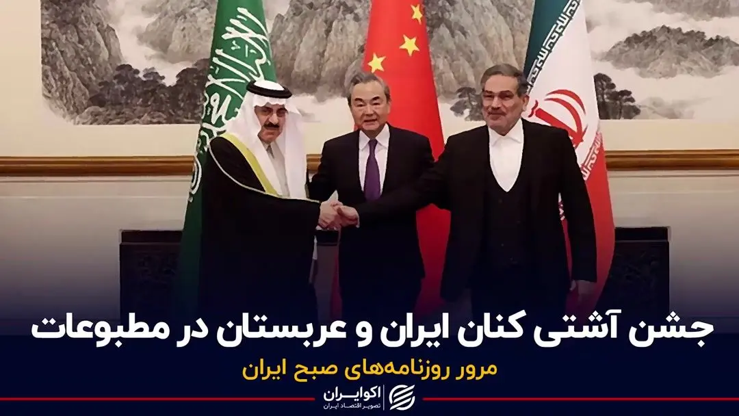 توافق ایران و عربستان در پکن، یکی از مهم‌ترین موضوعات خبری در صفحه یک روزنامه‌های امروز صبح تهران بود. روزنامه دنیای اقتصاد در این رابطه نوشته است: ایران و عربستان پس از هفت سال بحران سرانجام تصمیم گرفتند به بن‌بست دیپلماتیک خاتمه دهند و طی دو ماه آینده مسیر را برای برقراری روابط دیپلماتیک و تبادل سفیر فراهم کنند.