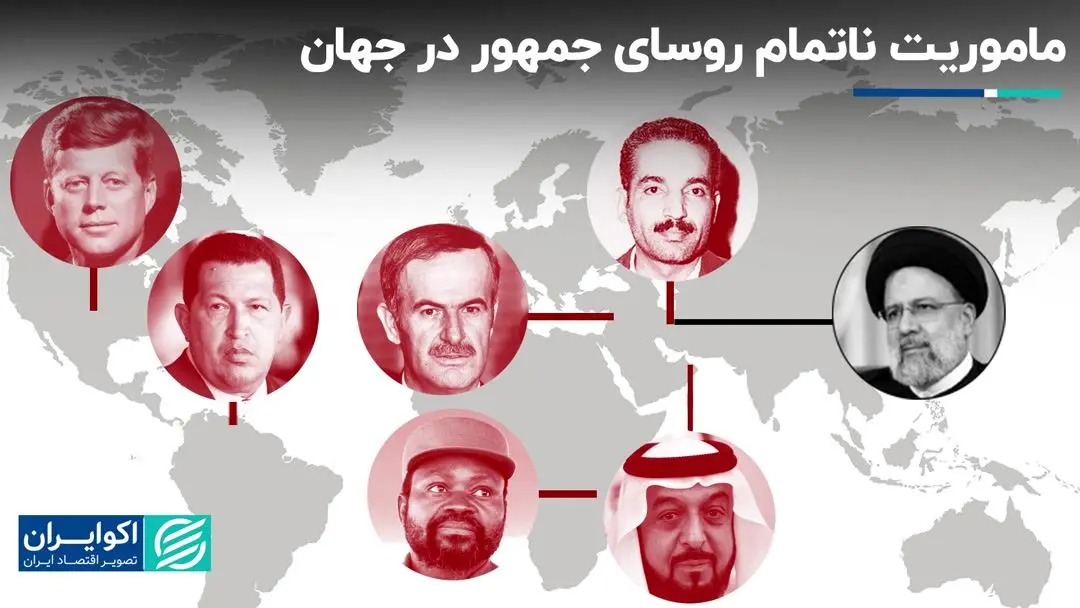 در سایر کشورهای جهان هم بسیاری از روسای جمهوری، به دلایل مختلف پیش از پایان دوره ریاست خود، از دنیا رفتهاند. برای مثال در آمریکا بیش از 8 نفر به دلایلی نظیر ترور یا مرگ طبیعی نتوانستند دوره ریاستجمهوری خود را به پایان برسانند. در این بین، فرانکلین روزولت و جان اف کندی به عنوان شاخصترین چهرهها شناخته میشوند.