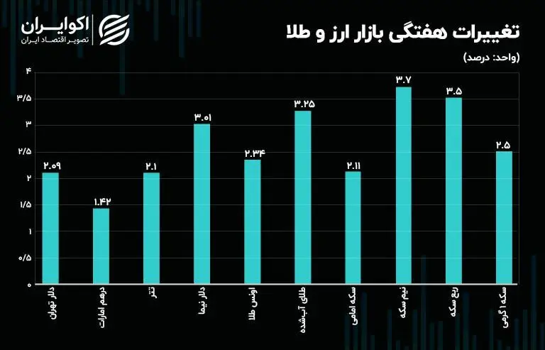 در این هفته شرایط برای بازار طلا بهتر بود زیرا علاوه بر رشد ۲.۰۹ درصدی دلار تهران، اونس طلا افزایش ۲.۳۴ درصدی را ثبت کرد و همدستی دلار و اونس جهانی منجر به بازدهی بیشتر در بازار طلا و سکه شد.  نیم سکه بیشترین بازدهی در بازار طلای داخلی را ثبت کرد و پس از آن ربع سکه در رتبه دوم قرار گرفت.