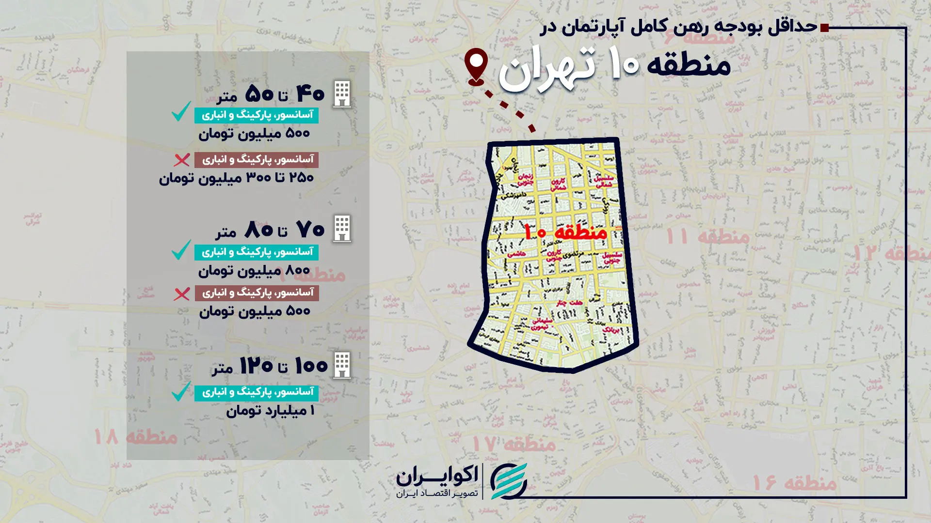 به گزارش اکوایران، بررسی بازار رهن و اجاره در منطقه ۱۰ تهران نشان میدهد حداقل مبلغ رهن مورد نیاز برای یک واحد آپارتمان ۴۰ تا ۵۰ متری در این منطقه بین ۲۵۰ تا ۳۰۰ میلیون تومان است. بهعنوان نمونه، در محله سلیمانی، یک آپارتمان ۴۰ متری با ۲۲ سال ساخت، بدون آسانسور، پارکینگ و انباری، با ۳۰۰ میلیون تومان رهن کامل آگهی شده است.
