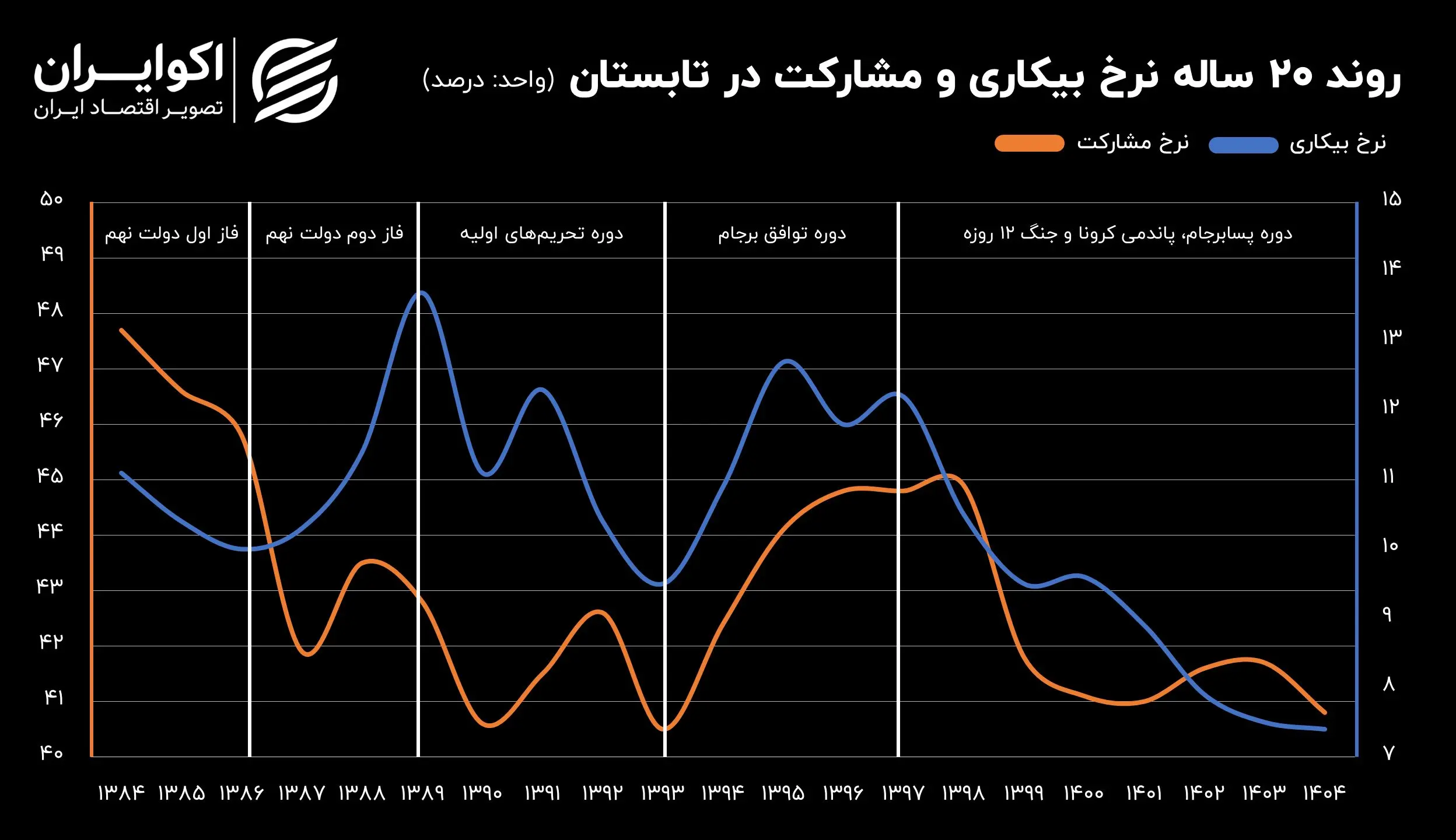 آمارها نشان میدهد از سال ۹۷ به بعد نرخ مشارکت و بیکاری هر دو کاهشی شده است. نرخ مشارکت به سطوح ۴۱ درصدی و نرخ بیکاری به پایین ترین سطح خود یعنی حدود ۷ درصد افول کرده است.