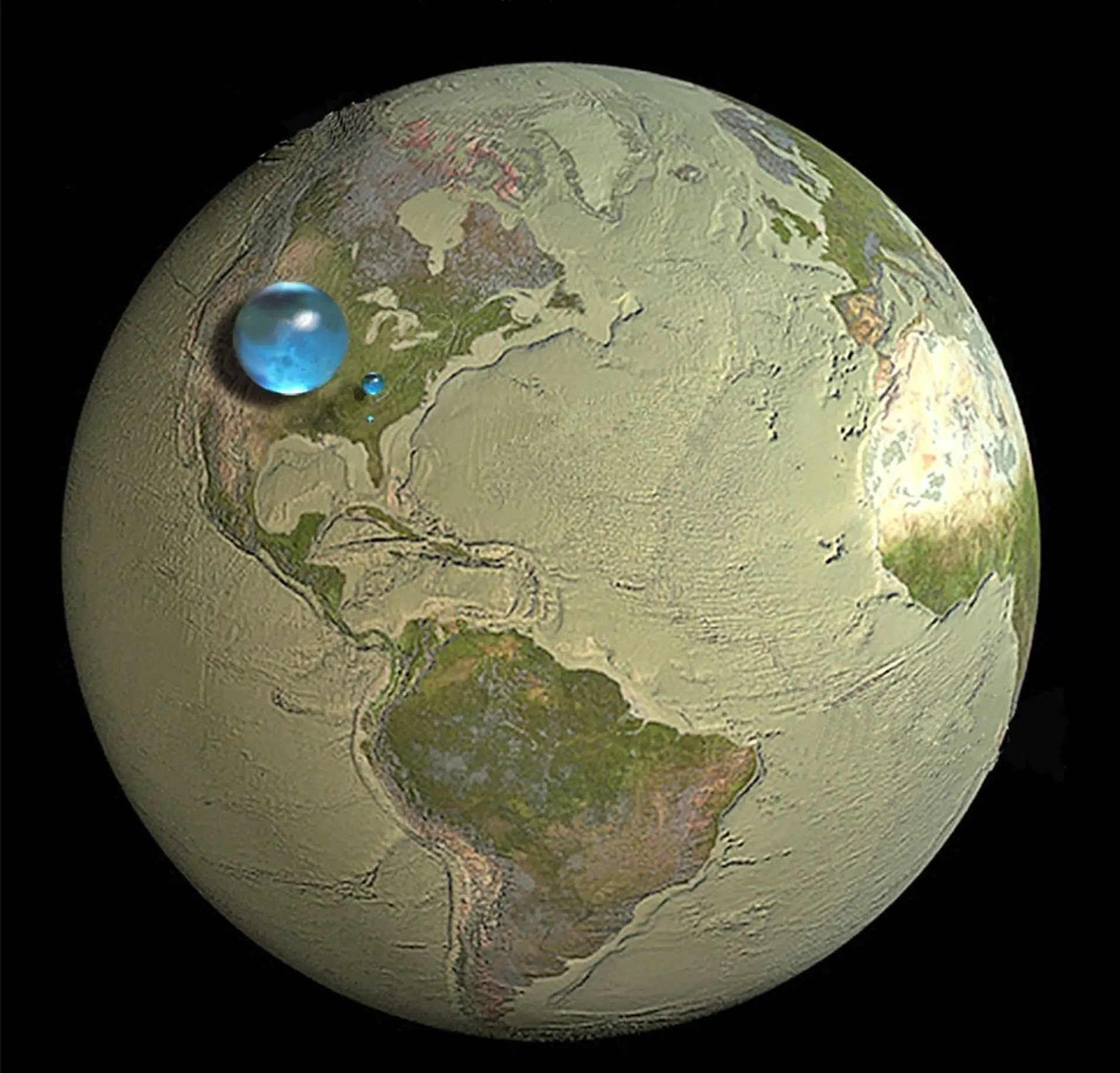 به گزارش اکوایران، ناسا در توضیح این تصویر نوشت: چه مقدار از سیاره زمین از آب ساخته شده است؟ در واقع، بسیار کم. اگرچه اقیانوسهای آب حدود ۷۰ درصد از سطح زمین را پوشاندهاند، اما این اقیانوسها در مقایسه با شعاع زمین کمعمق هستند. این تصویر نشان میدهد که اگر تمام آب رو یا نزدیک به سطح زمین به صورت یک توپ جمع شود، چه اتفاقی میافتد.