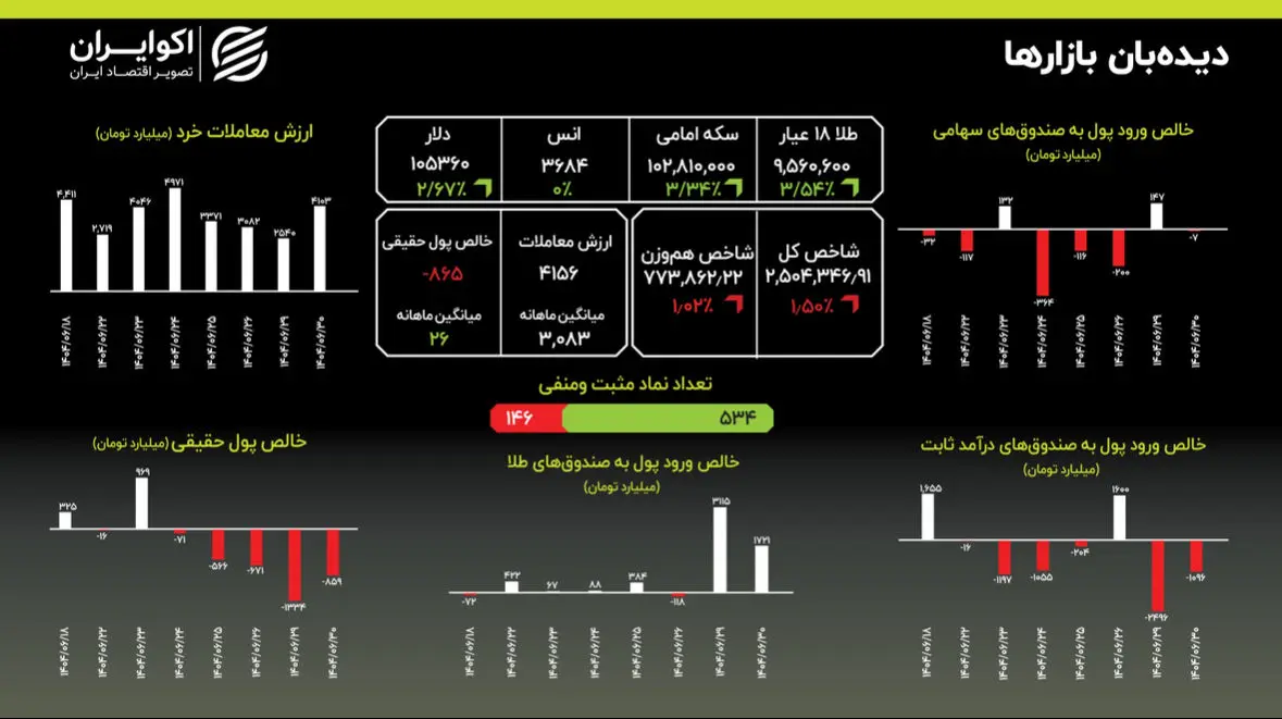 برای دومین روز متوالی، شاهد تثبیت الگوی فرار از داراییهای ریسکی به سمت داراییهای امن هستیم. این روند نشان میدهد بازارهای ایران در حال تعدیل خود با پارادایم جدید تورمی و اخبار سیاسی هستند و این روند تا زمان بروز عوامل تغییردهنده بنیادی و اخبار خوش بینانه ادامه خواهد یافت.