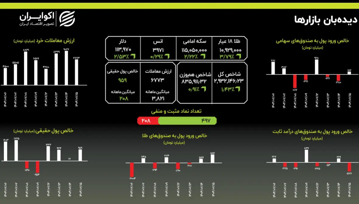 به گزارش اکوایران، بازارهای مالی ایران در روز سه شنبه ۱۵ مهر ماه، شاهد بازگشت چشمگیر نقدینگی به تمامی عرصه ها بود. این حرکت همزمان به سمت بازار سهام و طلا، در کنار رشد قوی قیمت دارایی ها، نشان از تغییر مجدد احساسات سرمایه گذاران و فعال شدن دوباره تقاضا دارد.