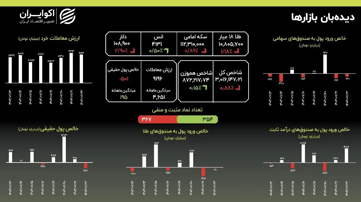 در محور قیمتها، کاهش نرخ ارز به وضوح اثر خود را گذاشت. قیمت طلای ۱۸ عیار با کاهش ۱.۱۸ درصدی به ۱۰,۸۰۵,۰۰۰ تومان و قیمت سکه امامی با کاهش ۰.۸۹ درصدی به ۱۱۲,۳۱۰,۰۰۰ تومان رسید. این در حالی بود که نرخ دلار آزاد با ریزشی محسوس به ۱۰۸,۹۰۰ تومان رسید.