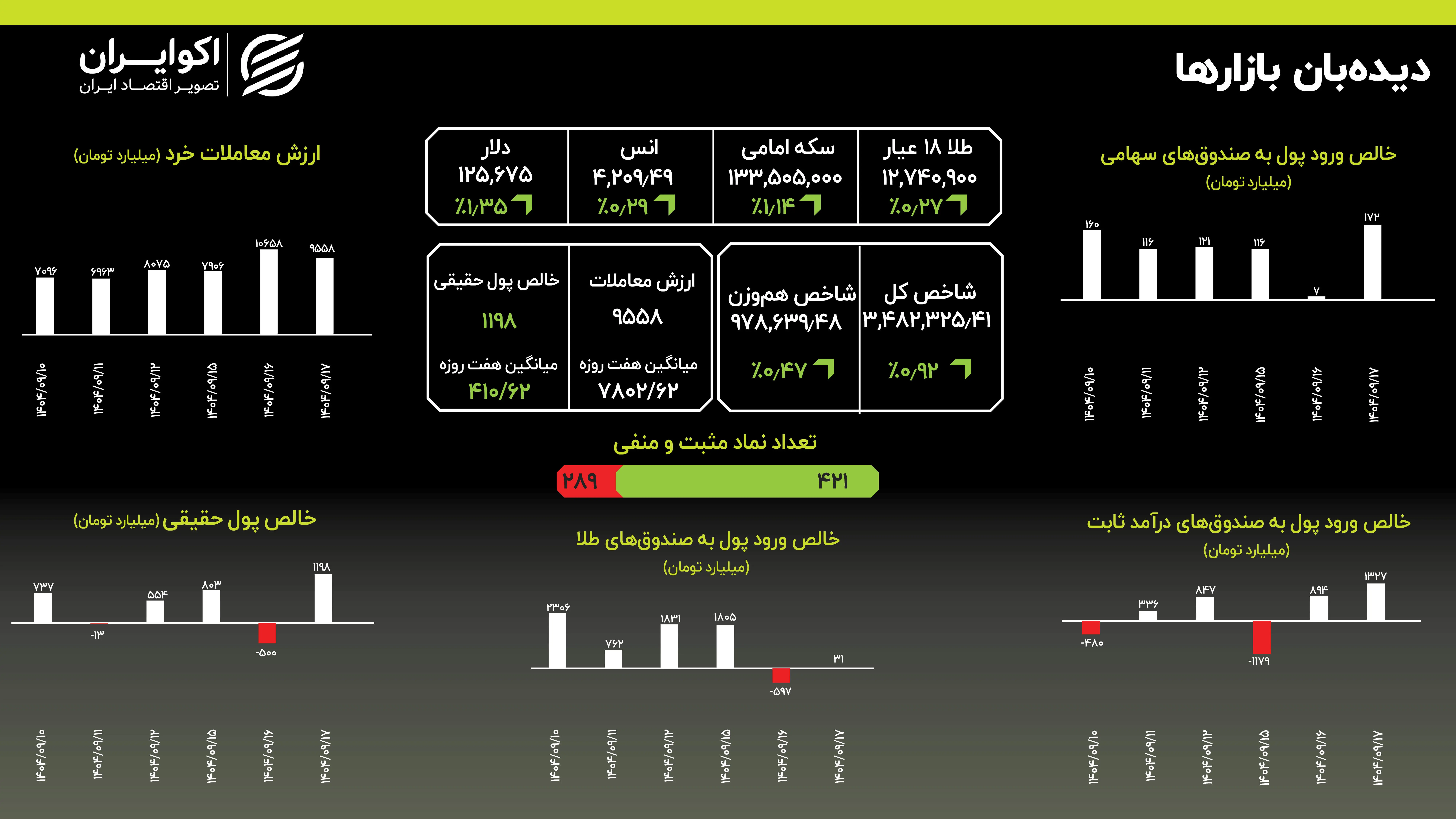 به گزارش اکوایران، بازارهای مالی ایران در روز دوشنبه ۱۷ آذر ماه، شاهد یک تغییر جهت چشمگیر و بازگشت امید به بازار سهام بودند. در این روز، خروج سنگین نقدینگی از کلیه بازارها متوقف شد و در عوض، شاهد هجوم سرمایه به بورس و تثبیت نسبی در بازار طلا بودیم. این تحول میتواند نشاندهنده بازگشت نسبی آرامش و ارزیابی مجدد فرصتها توسط سرمایهگذاران باشد.