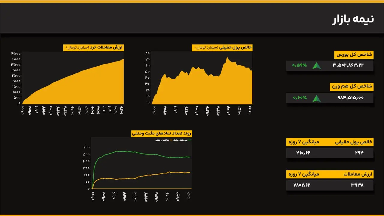 بر اساس داده‌های منتشرشده، ارزش معاملات خرد تا نیمه روز به ۳.۹ هزار میلیارد تومان رسید که ۵۰ درصد کمتر از میانگین هفتگی است. این کاهش چشمگیر در حجم معاملات در تقابل با ثبت رکورد تاریخی قرار دارد و می‌تواند نشان از عدم همراهی کامل معامله‌گران با این سطح از قیمت‌ها باشد.