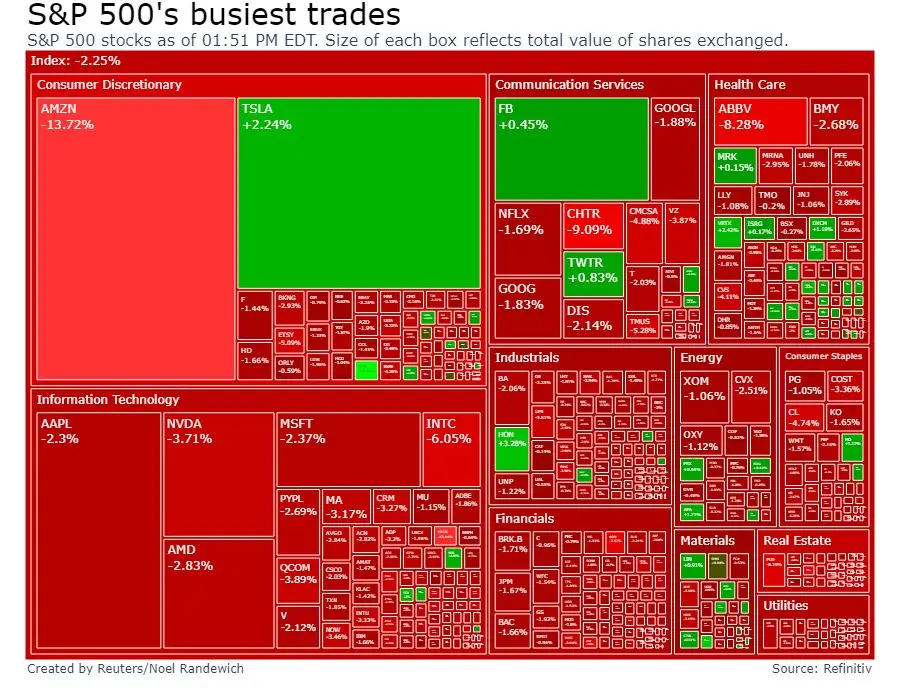 در روز جمعه 29 آوریل شاخص S&P500 بیشترین کاهش یک روزه ارزش از ژوئن 2020 را به ثبت رساند؛ همچنین در این روز شاخص نزدک نیز بزرگترین کاهش از سپتامبر 2020 را داشت. نتایج ضعیف شرکتهای فعال در بخش فناوری و با ارزشترین شرکتهای بورسی و نگرانی در خصوص تشدید سیاستهای پولی فدرال رزرو به این افت ارزش منجر شده است.