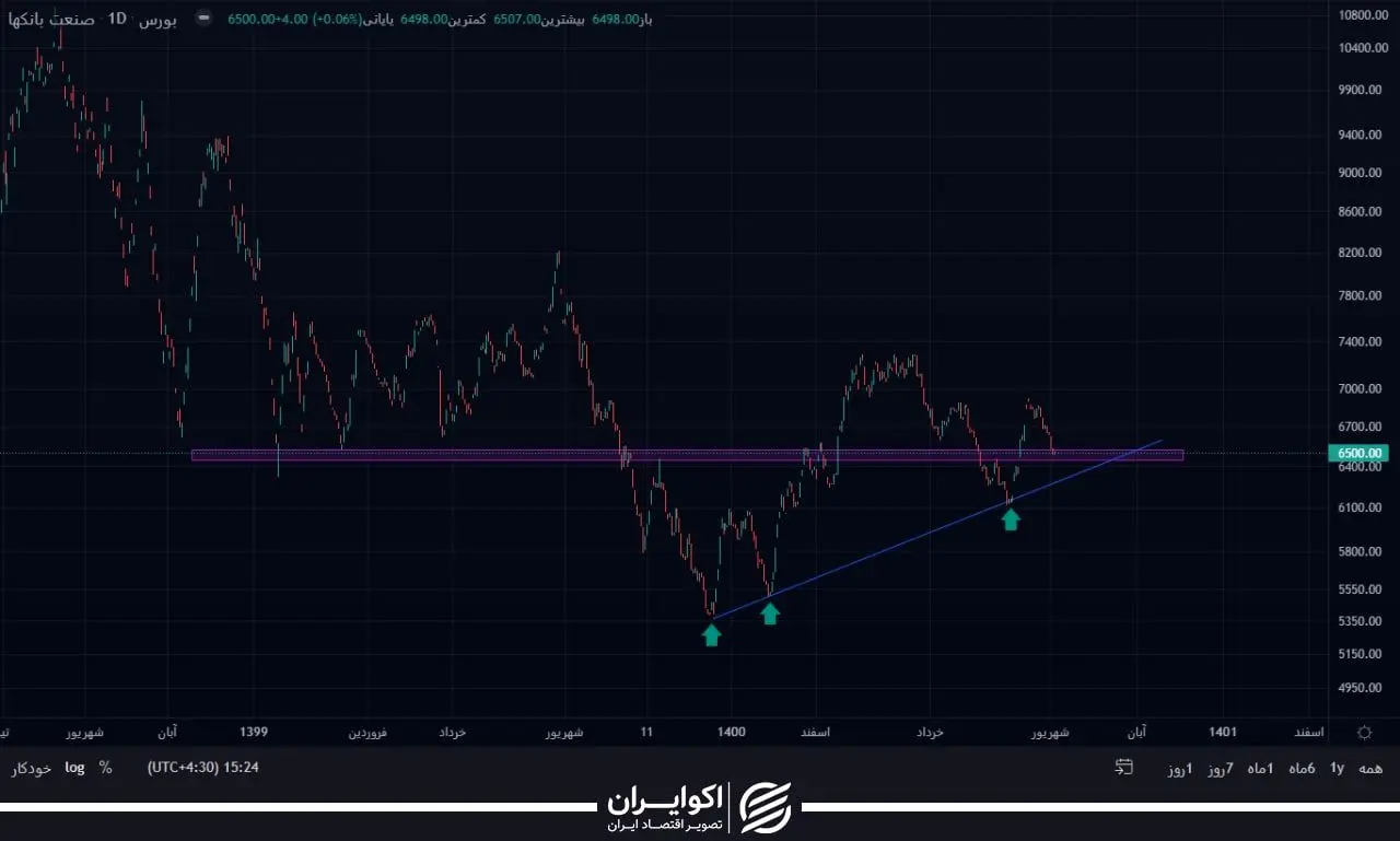 شاخص بانکی مدتی است در حوالی شاخص 6500 واحدی در حال ترید است و در طول دو سال گذشته دفعات زیادی با این محدوده برخورد داشته است و به همین دلیل این محدوده از درجه اهمیت بسیار بالایی برخوردار است.