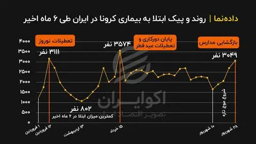 همزمان با افزایش قابل‌توجه تعداد مبتلایان به ویروس کرونا در کشور، ایرج حریرچی، معاون کل وزارت بهداشت از «انفجار کرونایی» در برخی شهرهای کشور از جمله قم و تبریز خبر داده است. در همین حال آخرین گزارش وزارت بهداشت از صعود دوباره مبتلایان روزانه کرونا به بالای ۳ هزار نفر حکایت می‌کند. در این داده‌نما روند پیک ابتلا به بیماری کرونا در ایران طی ۶ ماه اخیر را مشاهده کنید. منبع نمودار: همشهری