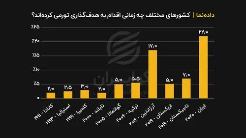 بانک مرکزی در خردادماه ۱۳۹۹ همزمان با اعلام رسمی تغییرات چارچوب سیاست پولی خود به هدفگذاری تورمی، هدف تورم خود را ۲۲ درصد با دامنه +/- ۲ درصد اعلام نمود. در این داده نما زمان اجرای هدفگذاری نرخ تورم و میزان آن را در کشورهای مختلف مشاهده می‌کنید.