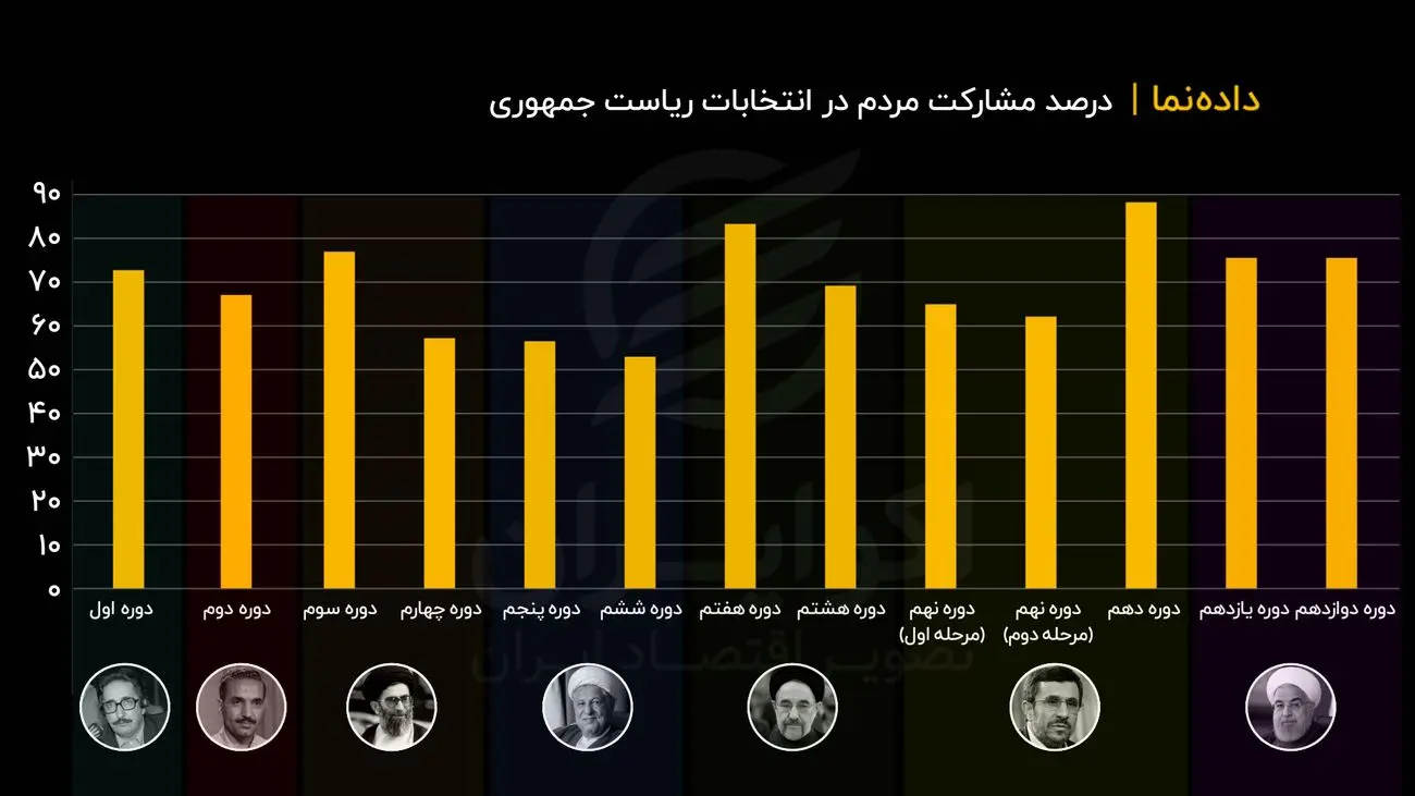 مشارکت مردم در انتخابات ریاست جمهوری مختلف متفاوت بوده است و نظرسنجی‌ها تا اینجای کار نشان می‌دهد که احتمالا در دوره سیزدهم، کمترین میزان مشارکت را شاهد باشیم. نگاهی بیاندازیم به درصد مشارکت مردم در انتخابات قبلی ریاست جمهوری در ایران.