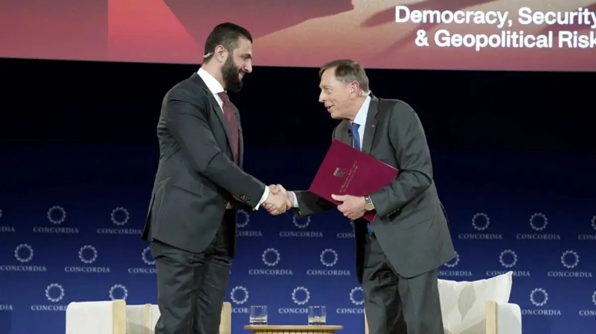 زمانی که پترائوس، به‌عنوان ژنرال آمریکایی، فرمانده عملیات «افزایش نیرو» بود، الشرع در عراق به دست ارتش آمریکا زندانی شد. الشرع یکی از هزاران خارجی بود که برای جنگیدن با آمریکایی‌ها به عراق رفت. پترائوس که خودش را «طرفدار» الشرع معرفی کرد، به طنز ماجرا اشاره کرد: دو دشمن قدیمی حالا در نشست سالانه کنکوردیا کنار هم نشسته بودند.