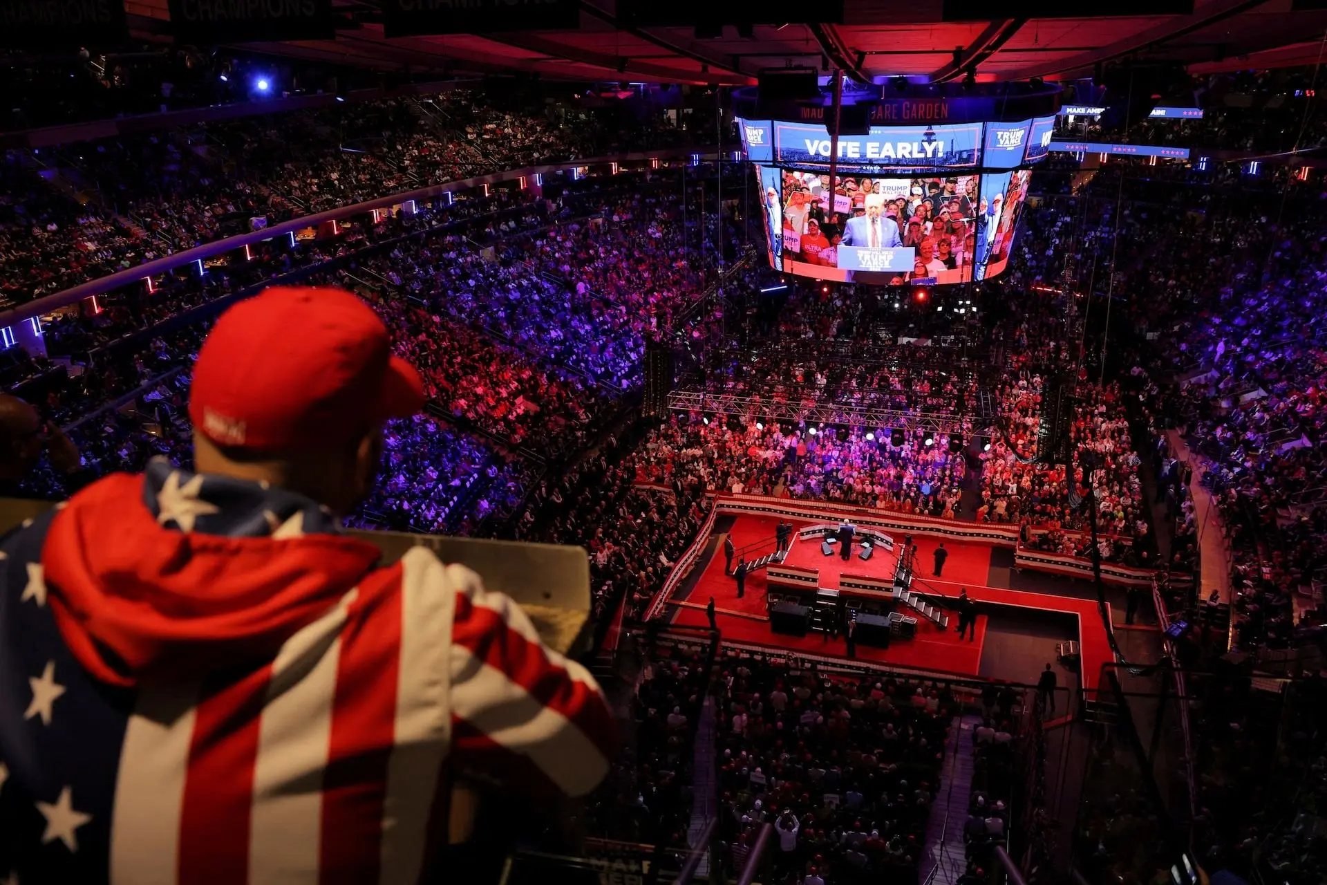 ترامپ که همیشه با انتقاد حتی برخی جمهوریخواهان مواجه شده بود، رویداد مدیسون اسکوئر گاردن خود را «جشن عشق» خواند و به اظهارات تونی هینچکلیف کمدین طرفدار ترامپ که پورتوریکو را «جزیره شناور زباله» خواند، توجهی نکرد. هینچکلیف همچنین پیش از روی صحنه رفتن ترامپ، جوکهای تحقیرآمیزی درباره سیاه پوستان، سایر لاتین تبارها، فلسطینیها و یهودیان گفت.