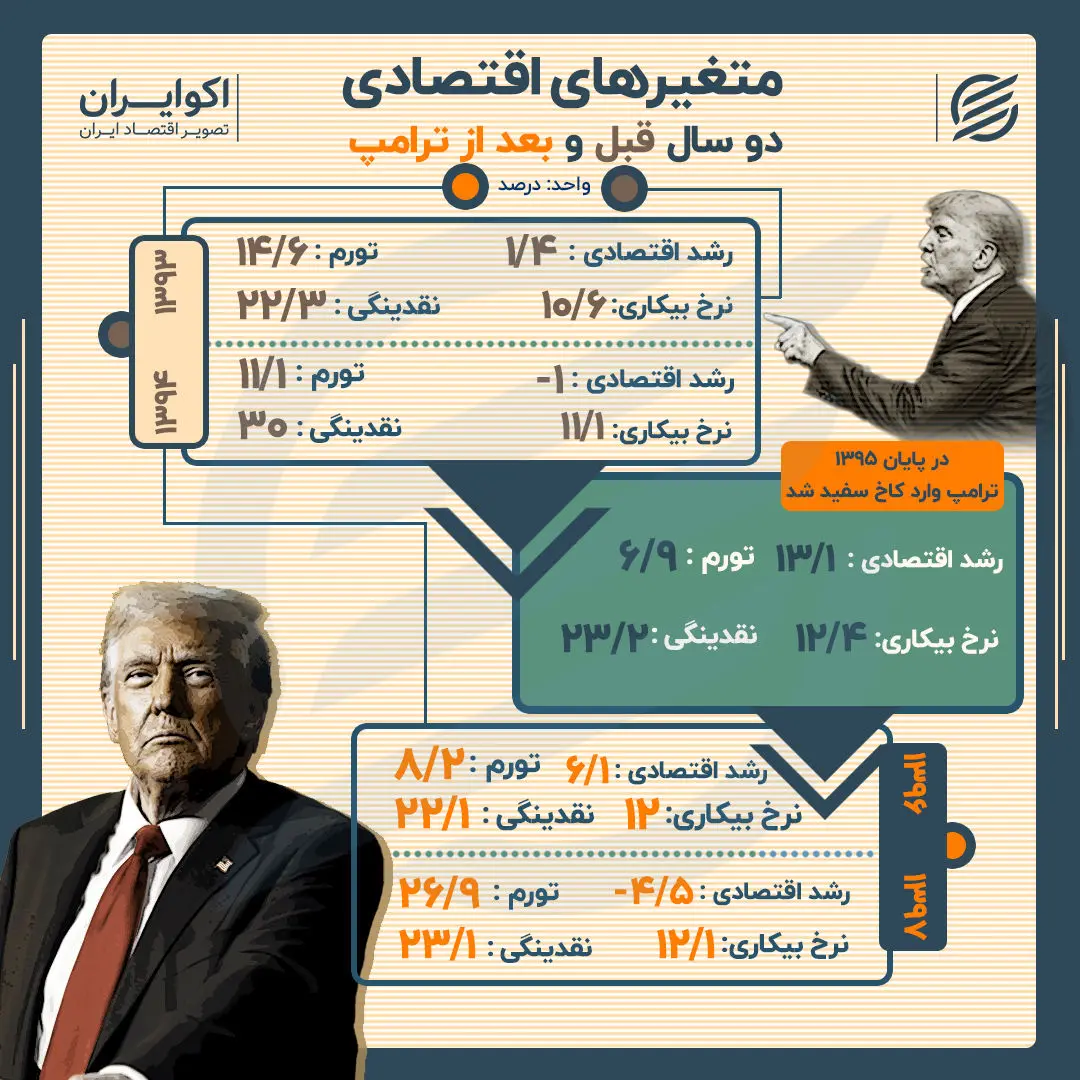 به علت پیروزی دونالد ترامپ برای دومین بار در انتخابات ریاست جمهوری آمریکا در این گزارش شاخصهای اصلی اقتصاد کشور در دو سال قبل و دو سال بعد از ورود ترامپ به کاخ سفید در سال 95 مورد بررسی قرار گرفته تا بتوان گفت آیا ریاست جمهوری او تاثیری بر اقتصاد کشور داشته یا خیر؟ و اینکه اقتصاد ایران در اثر ورود مجدد او به کاخ سفید باید در انتظار چه چیزی باشد.