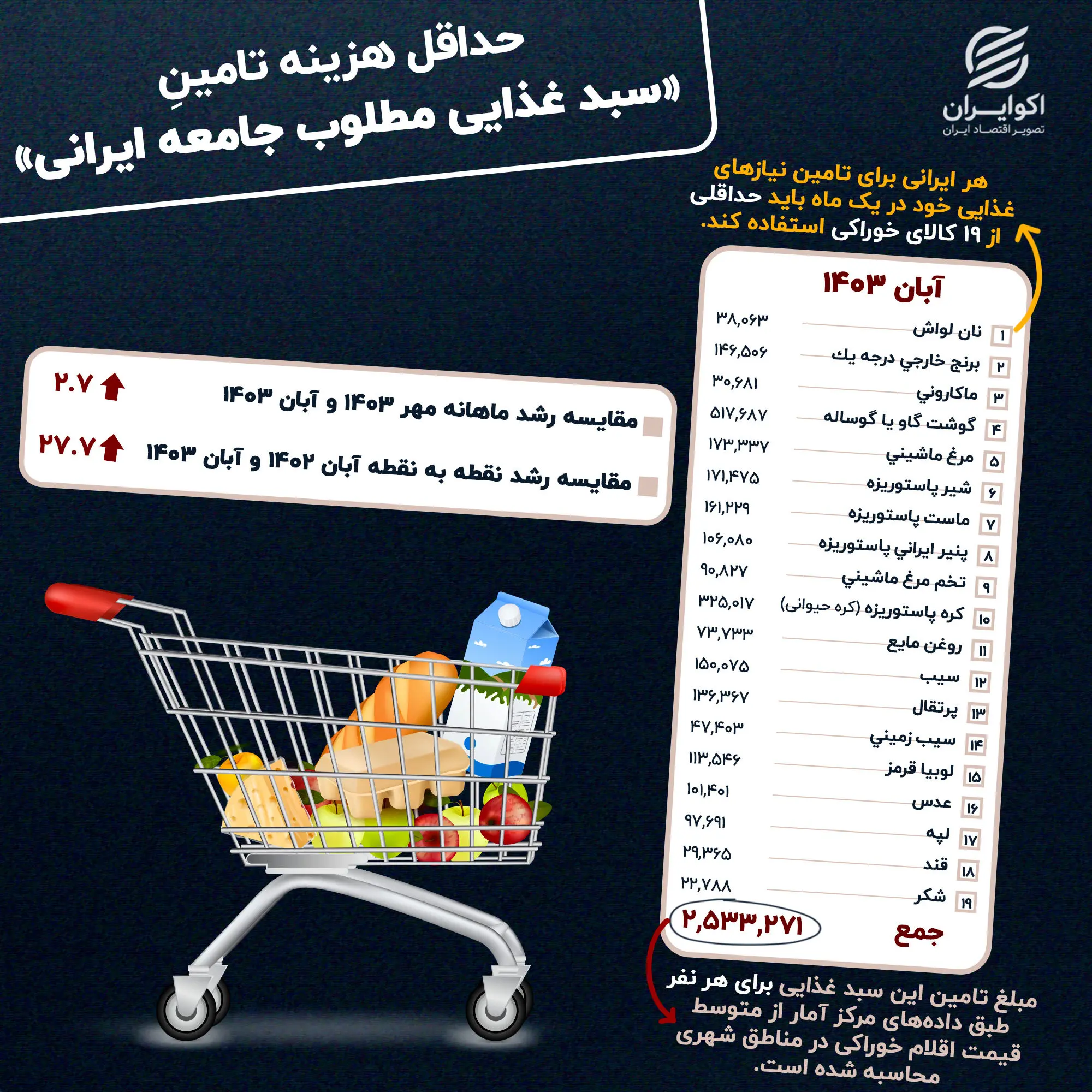 به گزارش اکوایران، «خوراک» یکی از نیازهای اساسی انسان است که تامین آن برای ادامه حیات و داشتن زندگی سالم ضروری است. به دلیل اهمیت ویژه‌ی تامین این نیاز، انستیتو تحقیقات تغذیه‌ای و صنایع غذایی کشور و دانشکده علوم تغذیه و رژیم‌شناسی دانشگاه علوم پزشکی تهران یک سبد خوراکی طراحی کرده‌اند که در برگیرنده نیازهای غذایی روزانه برای افراد است. این سبد شامل اقلامی است که اگر به اندازه ذکر شده مصرف شوند، نیازهای غذایی افراد تامین می‌شود. در واقع، اگر شخصی به میزانی که توسط این انستیتو اعلام شده، از اقلام موجود در سبد مصرف کند، احتمالا به مشکلاتی که ناشی از سوءتغذیه است، دچار نخواهد شد. با این حال، بررسی‌ها نشان می‌دهد که تامین این سبد حداقلی خوراکی ممکن است برای برخی از اقشار جامعه دشوار باشد چرا که قیمت این اقلام در هر ماه نوسان دارد و خریداری این سبد برای هر ایرانی در آبان سال جاری گران‌تر از آبان سال گذشته تمام می‌شود.