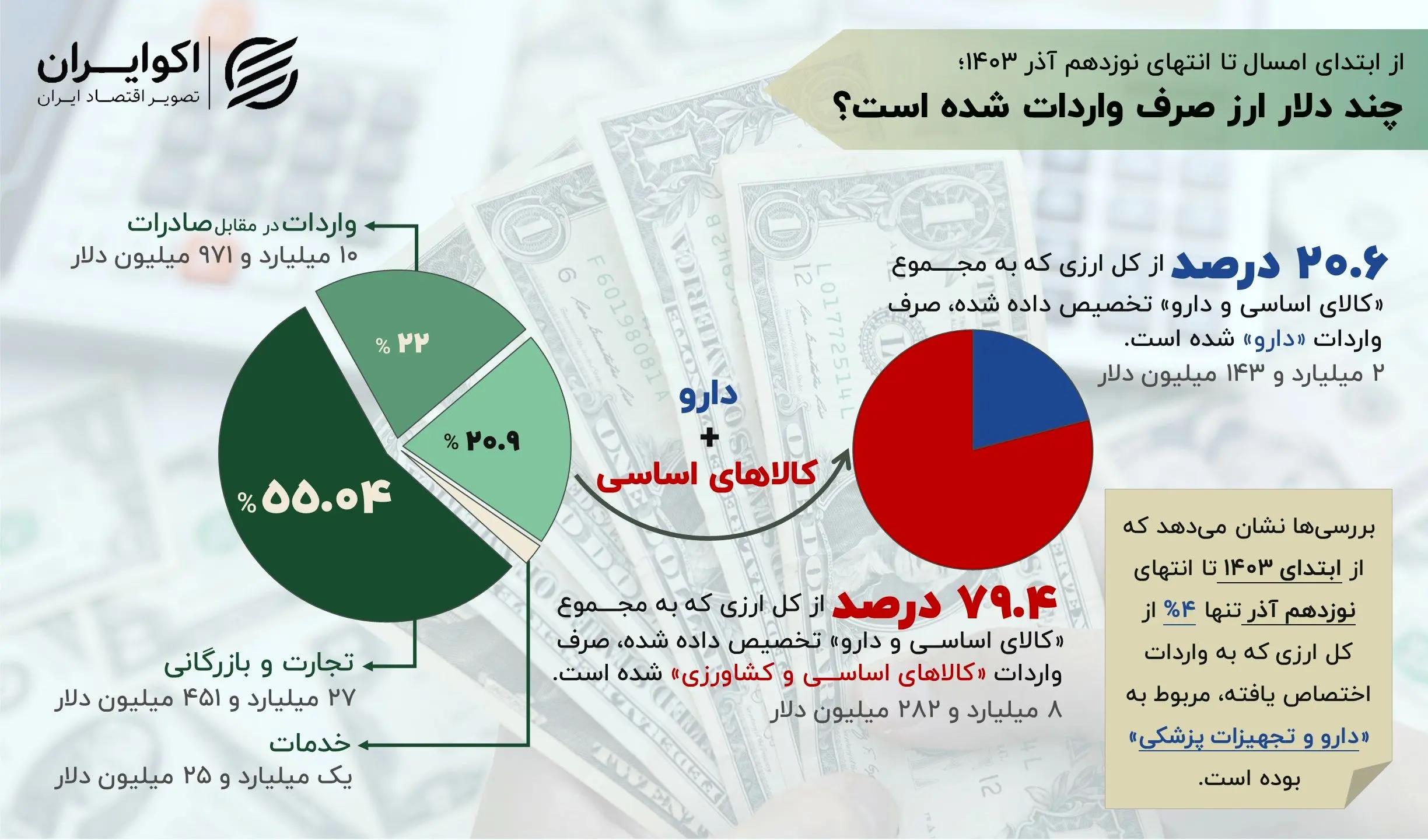 طبق اعلام بانک مرکزی، از ابتدای سال جاری تا انتهای نوزدهم آذر ماه 49 میلیارد و 872 میلیون دلار ارز به واردات اختصاص یافته است. از این رقم، بیش از 10 میلیارد دلار مربوط به واردات «کالاهای اساسی، کالاهای کشاورزی، دارو و تجهیزات پزشکی» بوده است. همچنین، بیش از 27 میلیارد دلار نیز به واردات کالاهای تجاری و بازرگانی اختصاص یافته است. در ادامه این آمار اشاره شده که به میزان 10 میلیارد و 971 میلیون دلار به «واردات در مقابل صادرات» و یک میلیارد و 25 میلیون دلار نیز به واردات «خدمات» ارز داده شده است.
