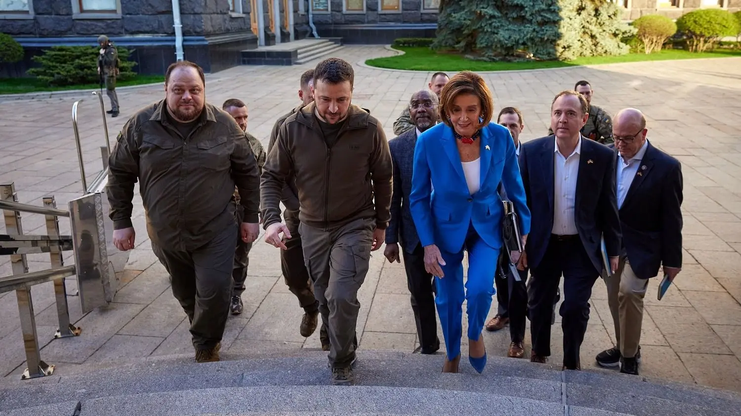فیلم منتشر شده در اوایل یک‌شنبه توسط دفتر رئیس‌جمهور ولودیمیر زلنسکی، پلوسی را در کی‌یف همراه با هیئتی از کنگره شامل جیسون کرو، جیم مک گاورن و آدام شیف نشان می‌دهد. زلنسکی پیش از آغاز جلسه با این هیئت پارلمانی گفت: «من از شما به خاطر این سیگنال حمایت قوی از سوی مردم و کنگره ایالات متحده  سپاسگزارم». زلنسکی گفت: «این نشان می‌دهد که ایالات متحده امروز رهبری حمایت گسترده از اوکراین در طول جنگ علیه تجاوزات فدراسیون روسیه را بر عهده دارد».