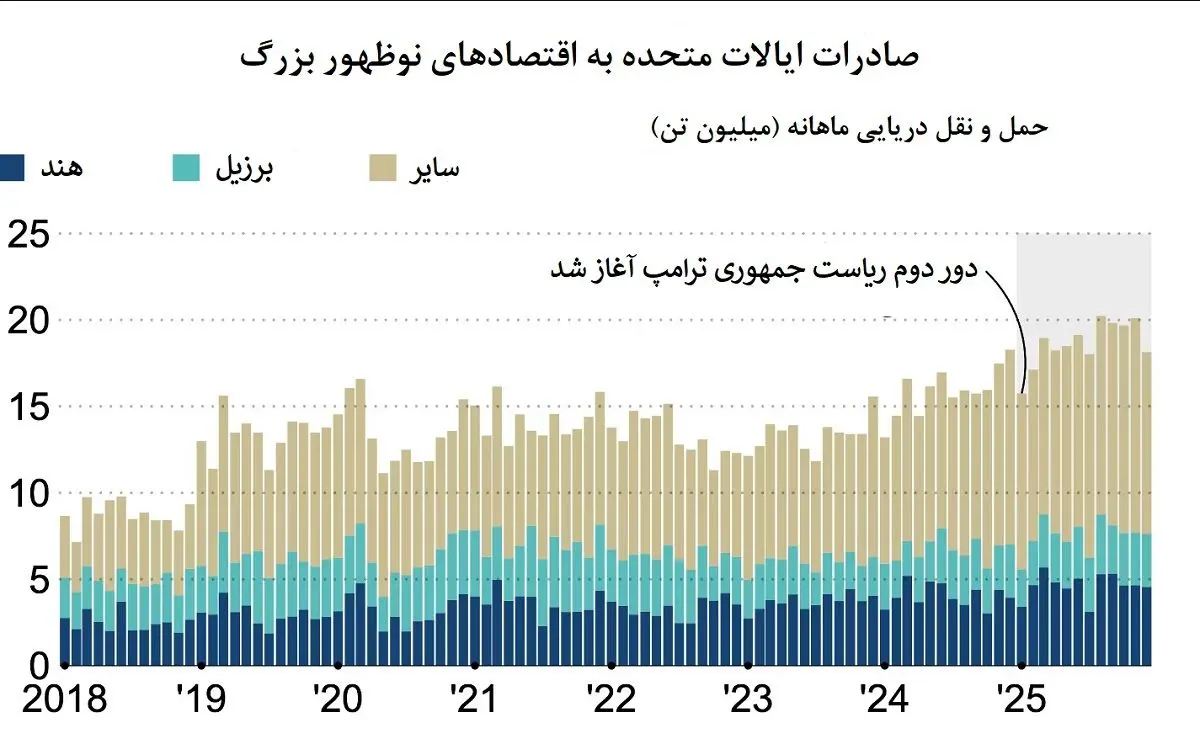 نیکی آسیا با استفاده از دادههای «کلپر» (Kpler)، ارائهدهنده اطلاعات تجاری، صادرات آمریکا به ۲۰ اقتصاد نوظهور بزرگ از جمله برزیل، هند، مالزی و ویتنام را تحلیل کرده است. این بررسی نشان میدهد حجم کل محمولههای دریایی از ۱۹۰ میلیون تن در سال ۲۰۲۴ به ۲۲۳ میلیون تن در سال ۲۰۲۵ افزایش یافته است. در این میان، برخی کشورهای آسیایی جهشهای ناگهانی در محصولاتی مانند ذرت و سویا ثبت کردند که تا حدی کاهش چشمگیر صادرات به چین را جبران کرد.