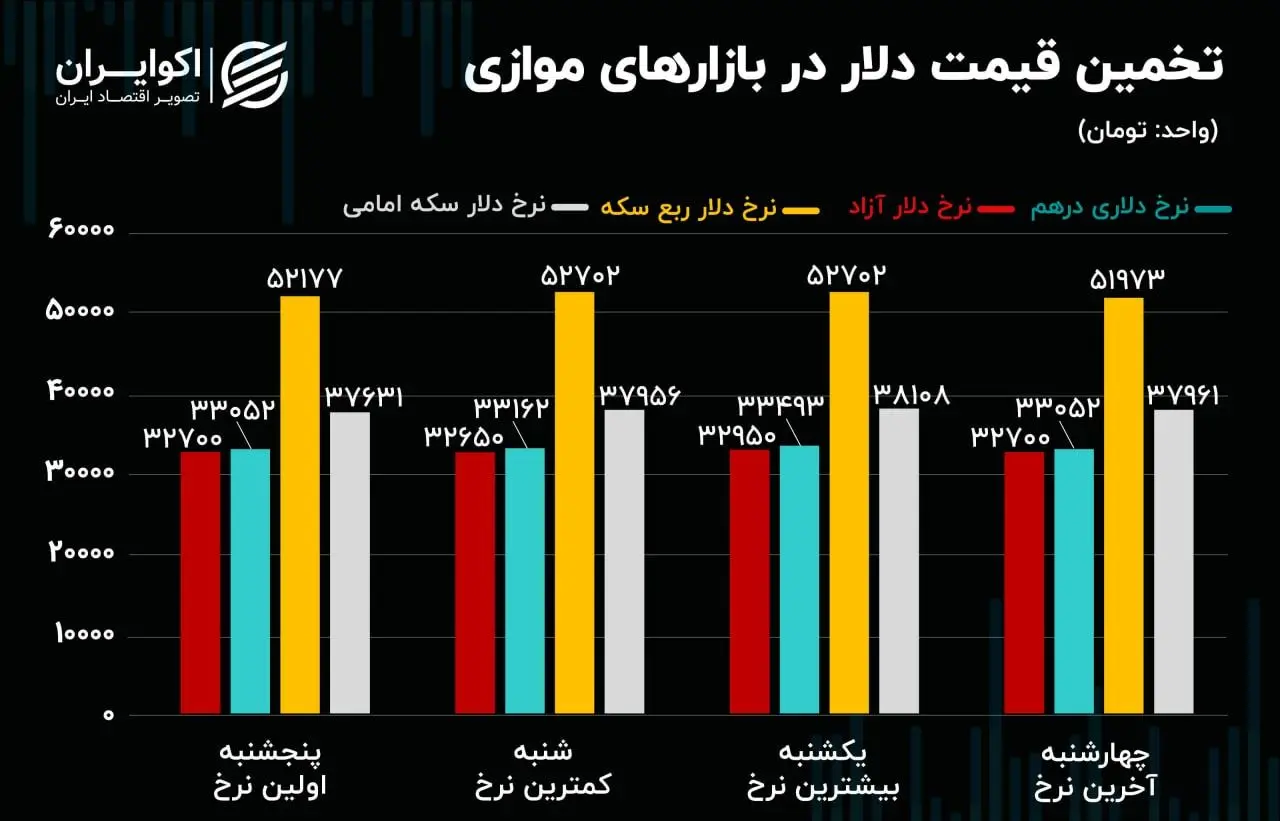 اکوایران قیمت پایانی دلار در بازارهای مختلف را در هر روز محاسبه میکند و در نموداری اولین، کمترین،بالاترین و آخرین قیمت هفته منتهی به آن روز را قرار می دهد.