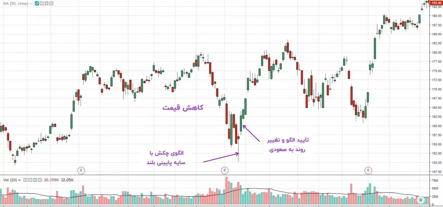 در ادامه نیز تأیید این الگو با شکلگیری یک کندل صعودی بلند را مشاهده میکنید. تأیید الگو نیز در شرایطی ایدهآل شکل گرفته است و کندل سبزرنگ ضمن اینکه بالاتر از قیمت بستهشدن کندل چکش بسته شده است، ارتفاع زیادی دارد. در ادامه نیز روند بازار برای مدتی قابلتوجه صعودی بوده است.