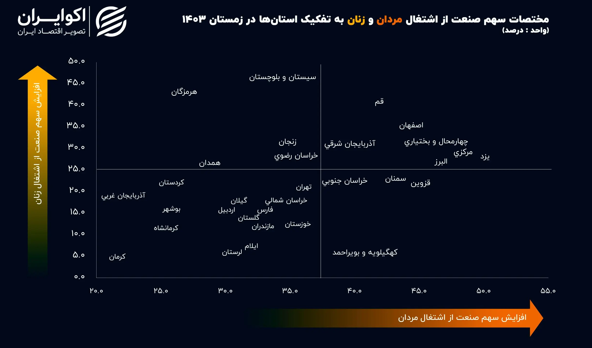 به عبارتی در زمستان سال گذشته در استانهایی که سهم صنعت از اشتغال مردان پایینتر از 37.5 درصد و از اشتغال زنان کمتر از 25 درصد بوده، سهم صنعت از اشتغال هر دو گروه پایین بوده است.